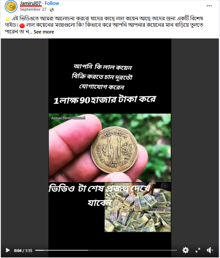 যেমন: Jamirul07 নামে একটি আইডি থেকে ভিডিও সহ পোস্টে লেখা হয়েছে, “আপনি কি লাল কয়েন বিক্রি করতে চান, দ্রুত যোগাযোগ করুণ! ১ লক্ষ ৯০ হাজার টাকা করে প্রতিটি কয়েন।”