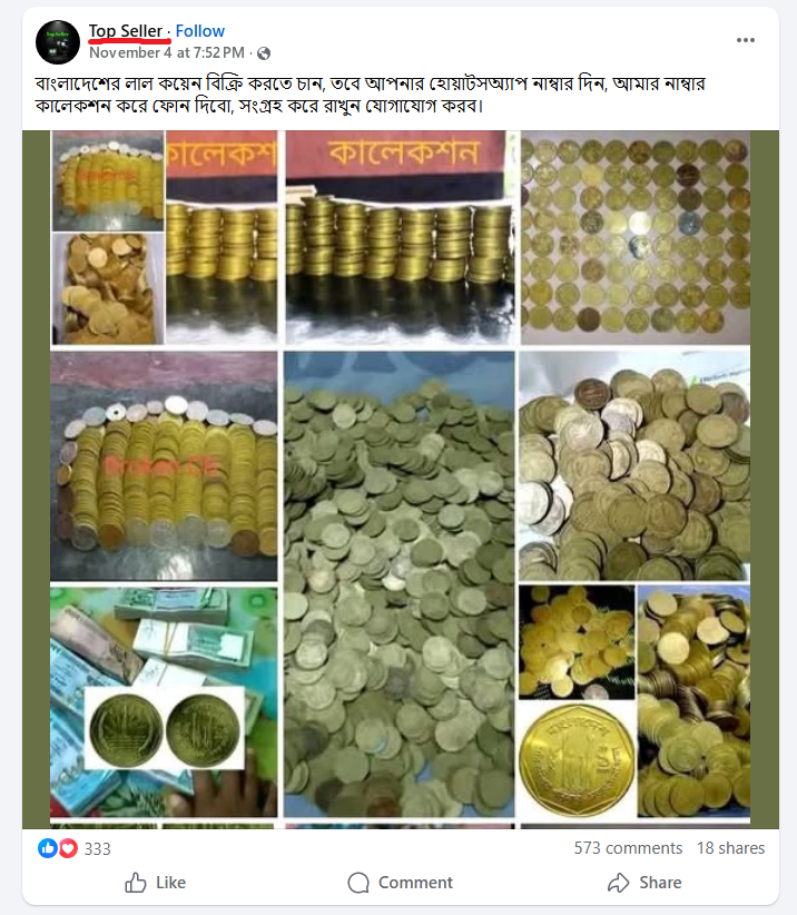 একইভাবে, ‘লাল কয়েন সেল’ নামে একটি পেজের পোস্টে বলা হয়েছে, “১ টাকা কয়েনের মূল্য এখন ২ লক্ষ টাকা। আছে কি আপনার হাতে? তাহলে আর দেরি কিসের এখনই আমাদের ওয়েবসাইটে যোগাযোগ করুন।”