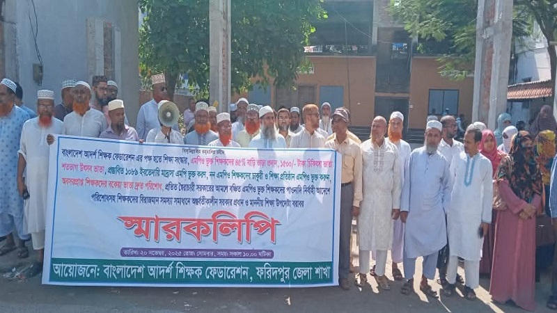 সাত দফা ন্যায্য দাবি বাস্তবায়নের দাবিতে বাংলাদেশ আদর্শ শিক্ষক ফেডারেশনের উদ্যোগে ফরিদপুরে মানববন্ধন ও বিক্ষোভ সমাবেশ অনুষ্ঠিত হয়েছে। সোমবার সকাল
