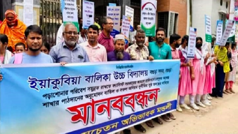 বগুড়ায় ইয়াকুবিয়া বালিকা উচ্চ বিদ্যালয়ে কলেজ শাখার পাঠদানের অনুমোদন বাতিল এবং প্রতিষ্ঠানের সকল অনিয়ম-দুর্নীতির সুষ্ঠু তদন্তের দাবিতে মানববন্ধন অনুষ্ঠিত হয়েছে।